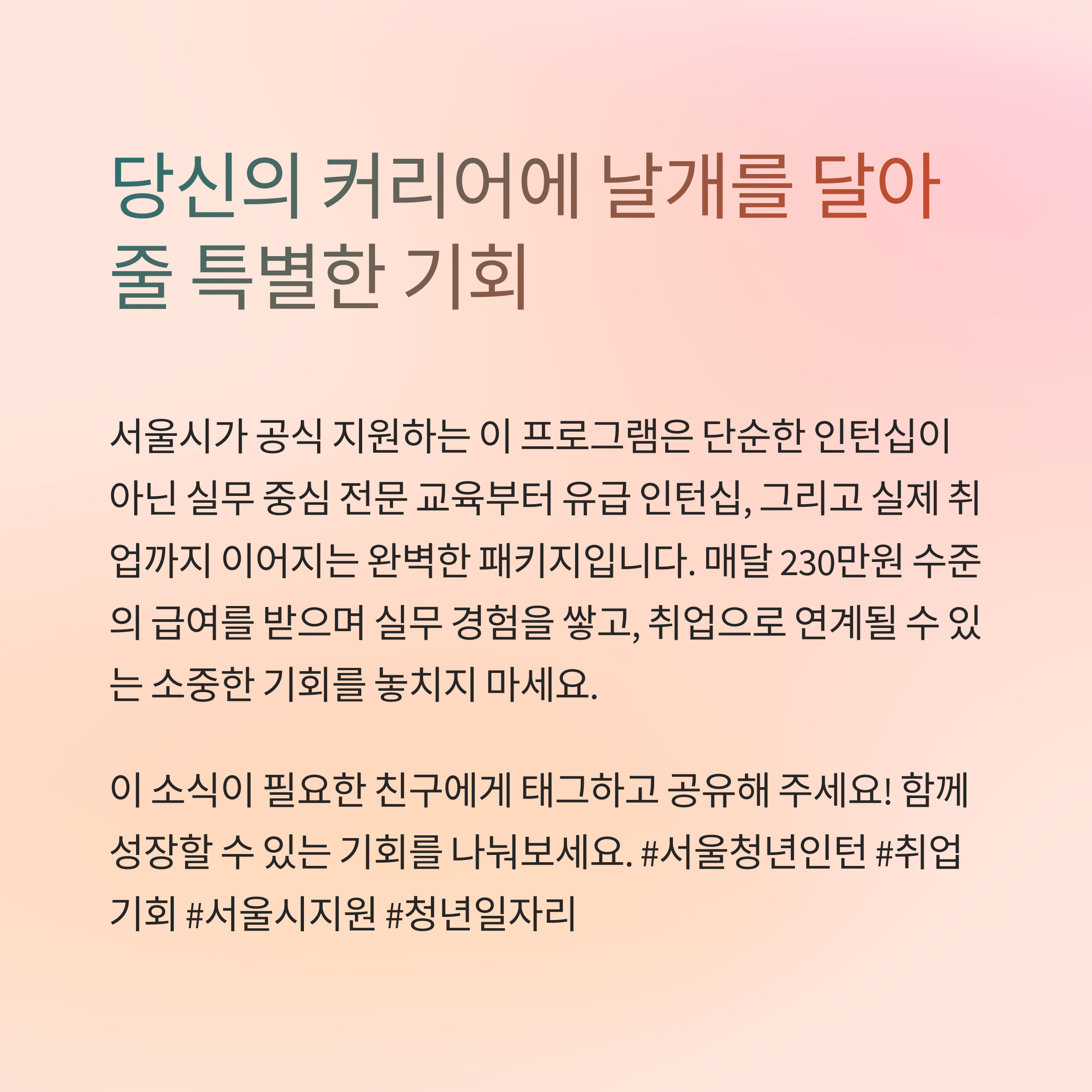 ‘실무 경험이 없다’는 이유로 취업에서 밀린다면, 이번 인턴십이 분명 전환점이 될 수 있습니다. 서울시가 청년을 위해 준비한 실전형 인턴십 프로그램에 지금 도전해보세요.