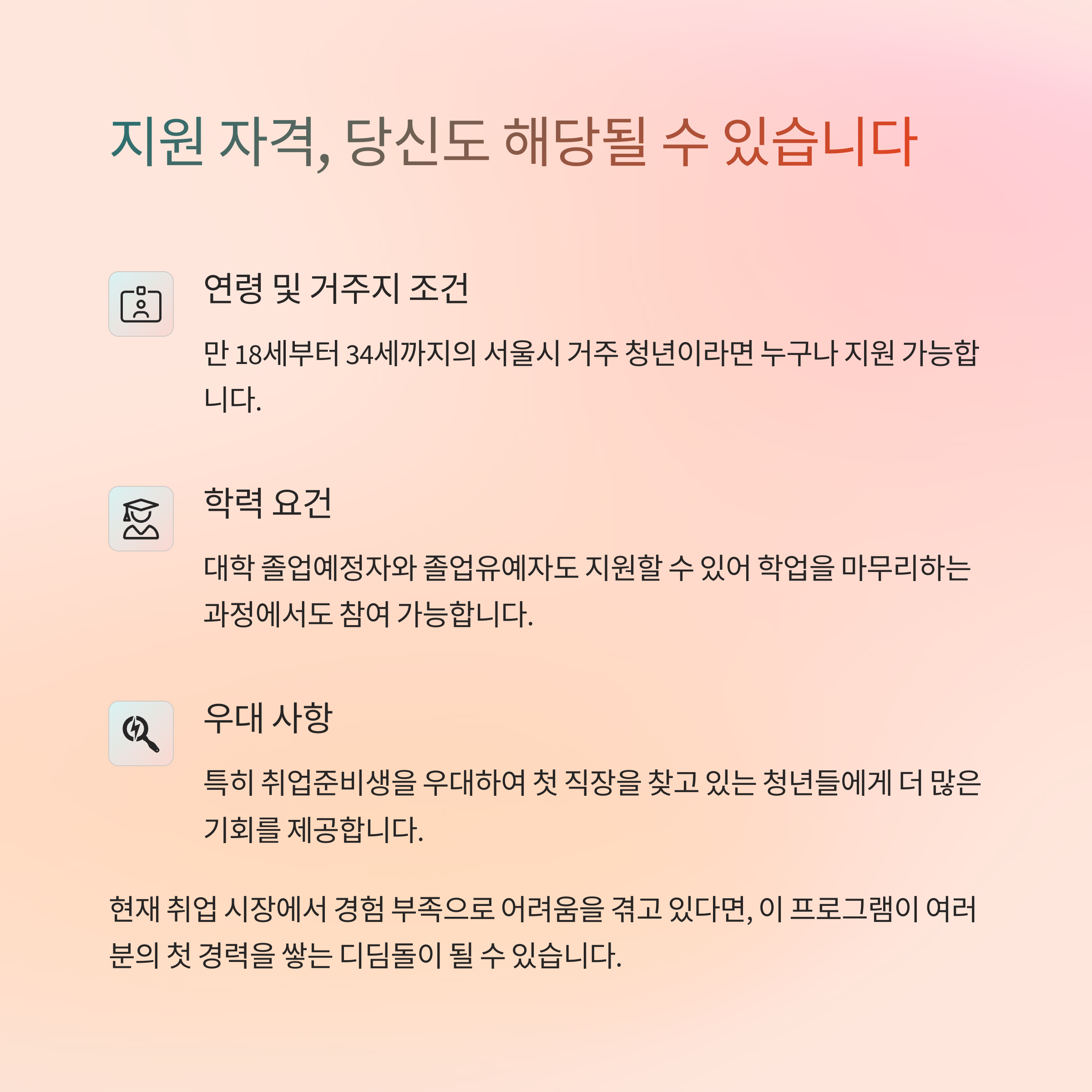 - 지원 대상: 서울시 거주 만 18세 ~ 34세 미취업 청년 (재학생 제외, 졸업예정자는 가능)