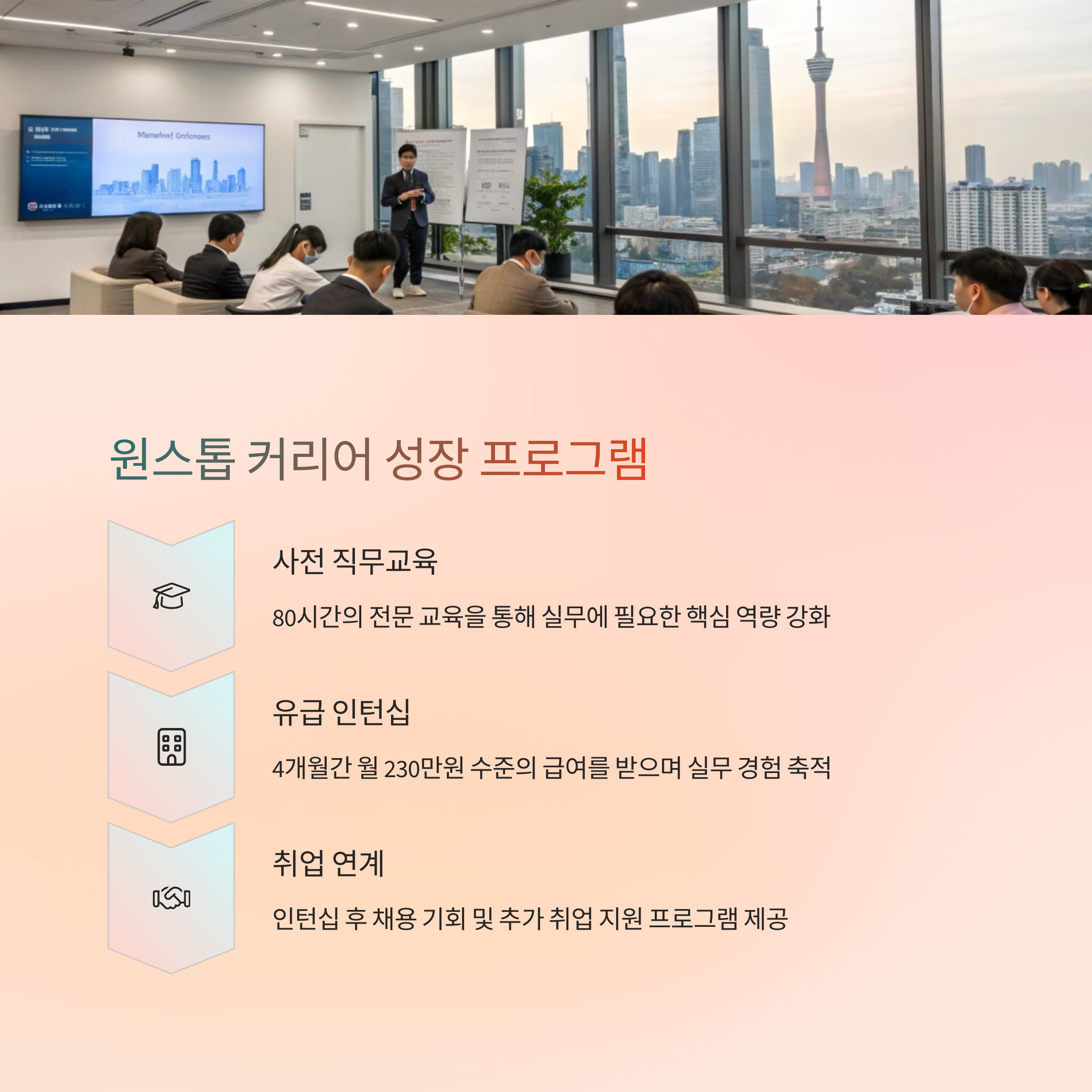 - 사전 직무교육 (5~6월): 총 80시간 오프라인 교육. 실무 교육과 취업 컨설팅 포함.