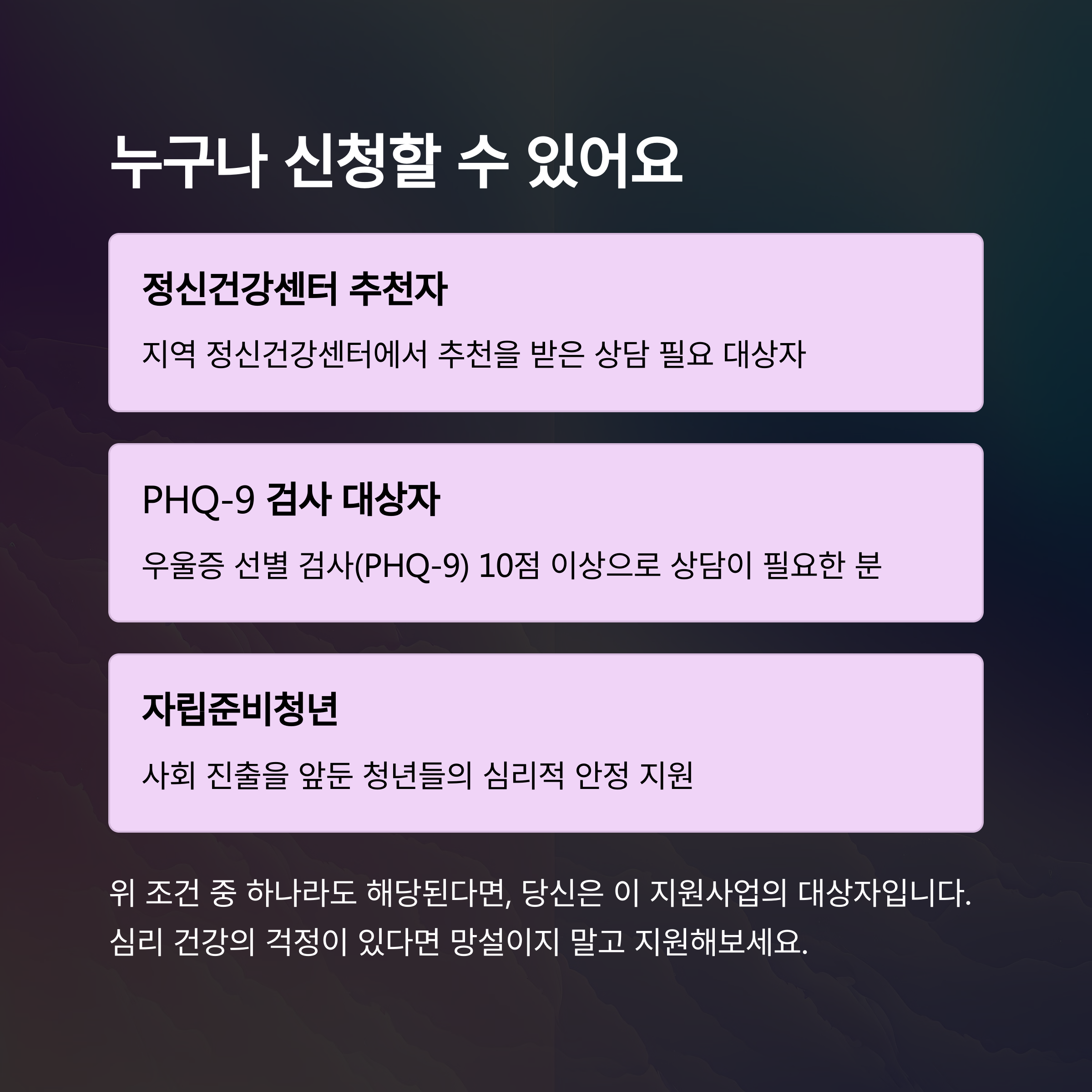 A. 학교상담센터나 복지센터의 추천서, 또는 국가검진 결과(PHQ-9 10점 이상)만으로도 신청 가능합니다.