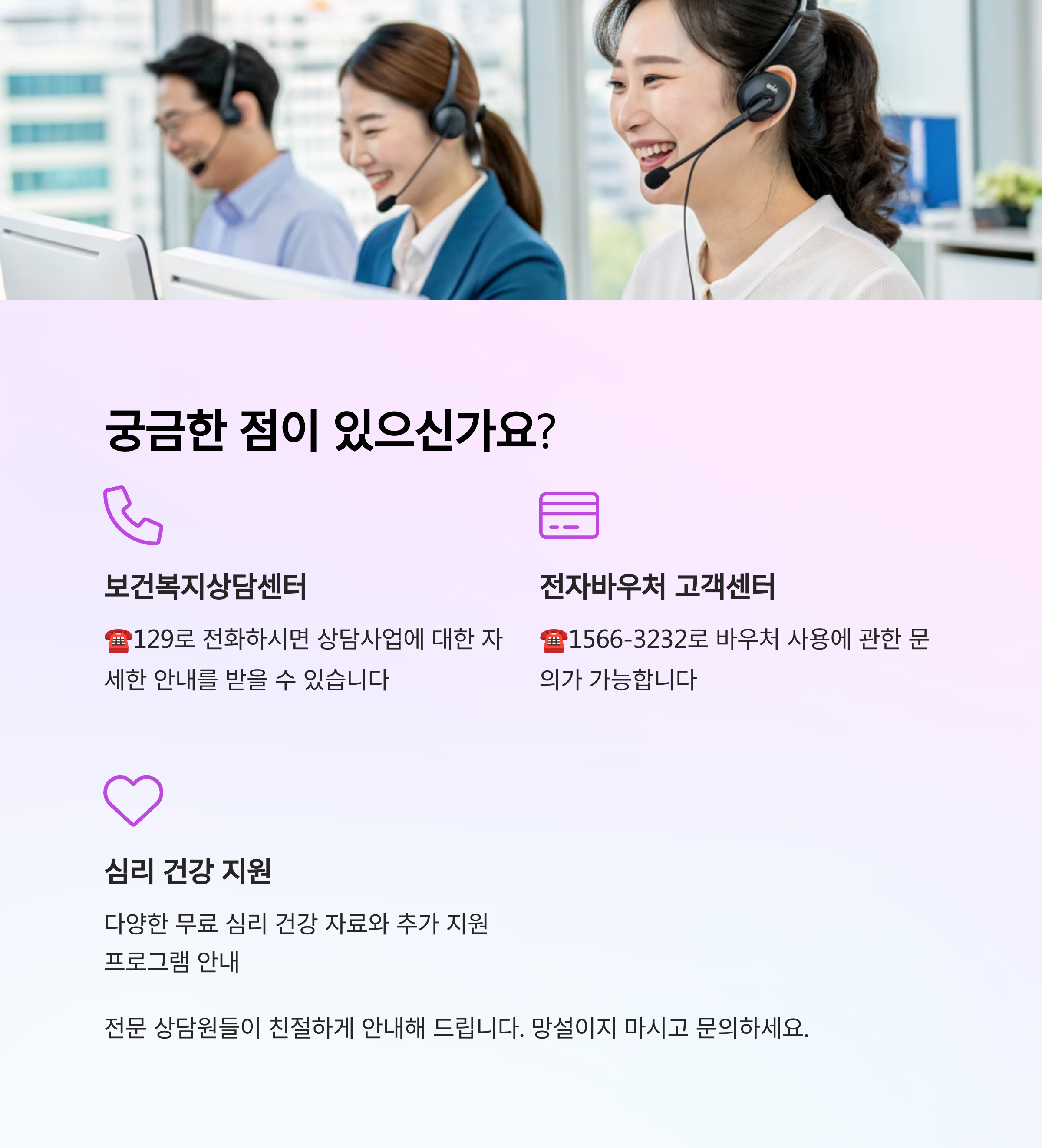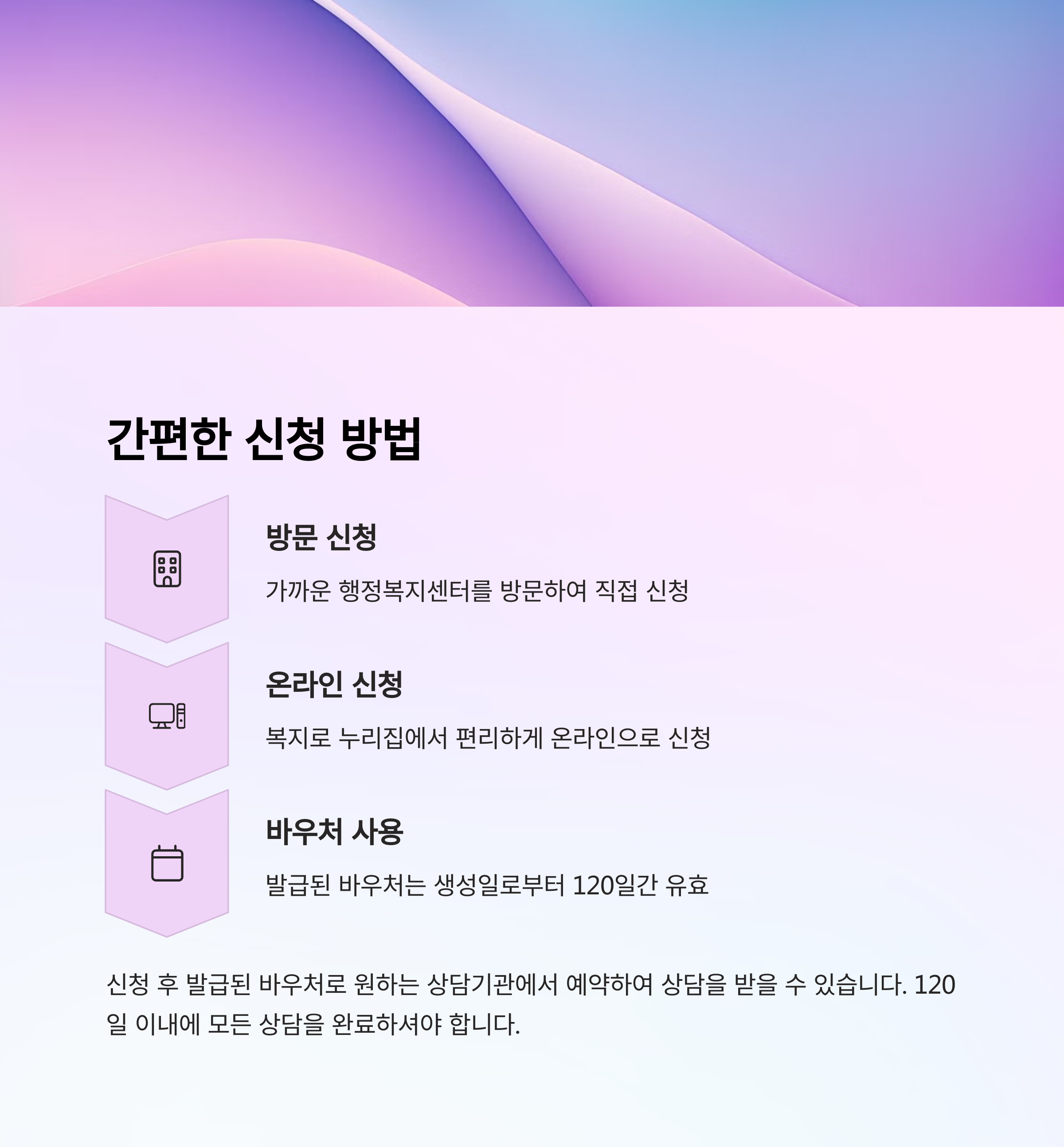 혼자서 마음의 무게를 견디고 있다면, 지금 이 제도를 이용해 보세요. 정부에서 제공하는 '전국민 마음투자 지원사업'은 단순한 상담이 아니라, 여러분의 삶을 다시 일으켜줄 수 있는 아주 현실적인 지원입니다. 가까운 행정복지센터 또는 온라인으로 지금 바로 신청해 보세요.