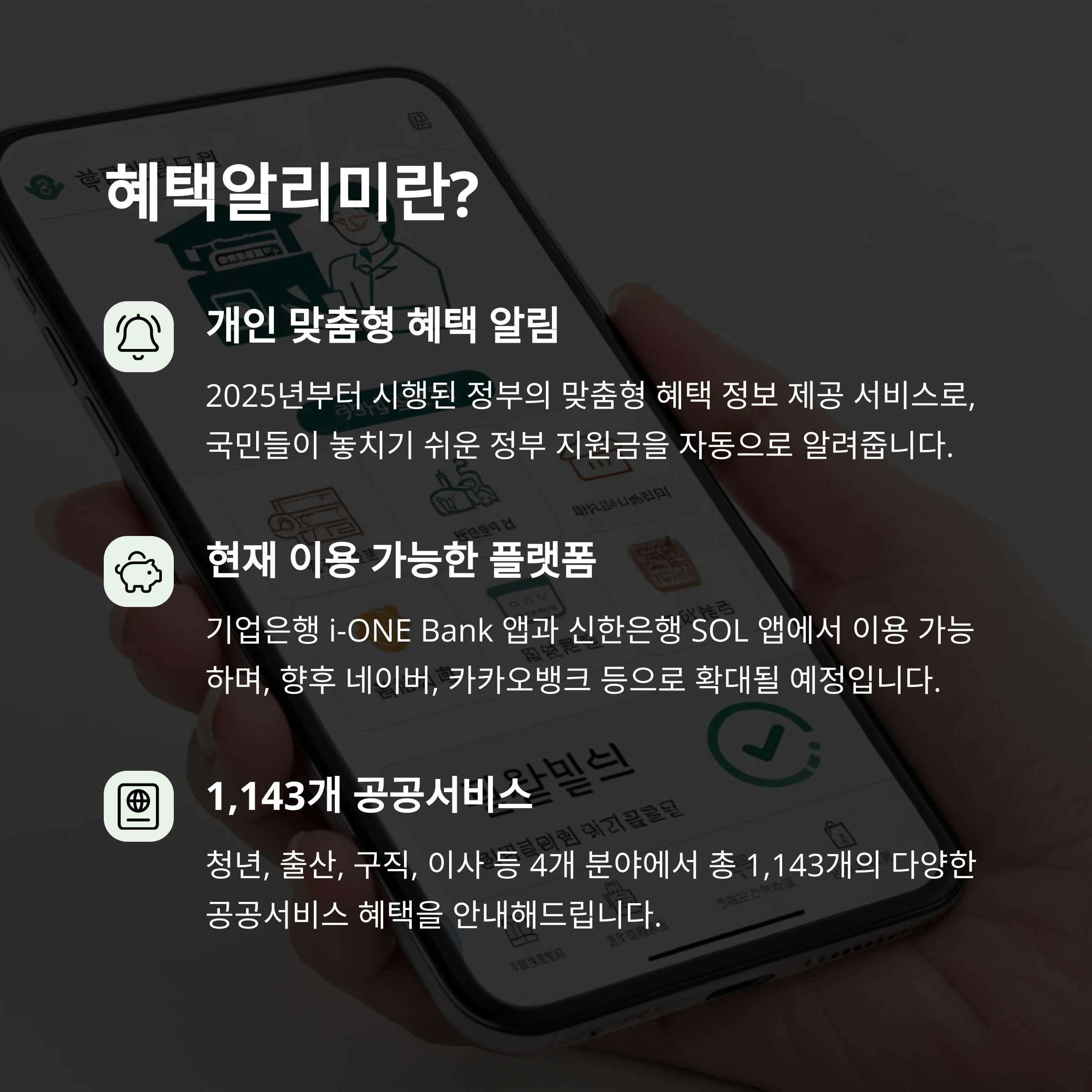 ‘혜택알리미’는 행정안전부에서 만든 맞춤형 공공 서비스입니다. 2025년부터 기업은행 i-ONE 뱅크와 신한은행 SOL 뱅크 앱을 통해 제공되기 시작했어요. 가입만 해두면 이후에는 별도의 로그인 없이 나에게 꼭 맞는 정부 혜택을 자동으로 받아볼 수 있어요. 현재 제공 중인 혜택 수는 무려 1,143개, 2026년까지는 3,600개 이상으로 확대될 예정이랍니다!