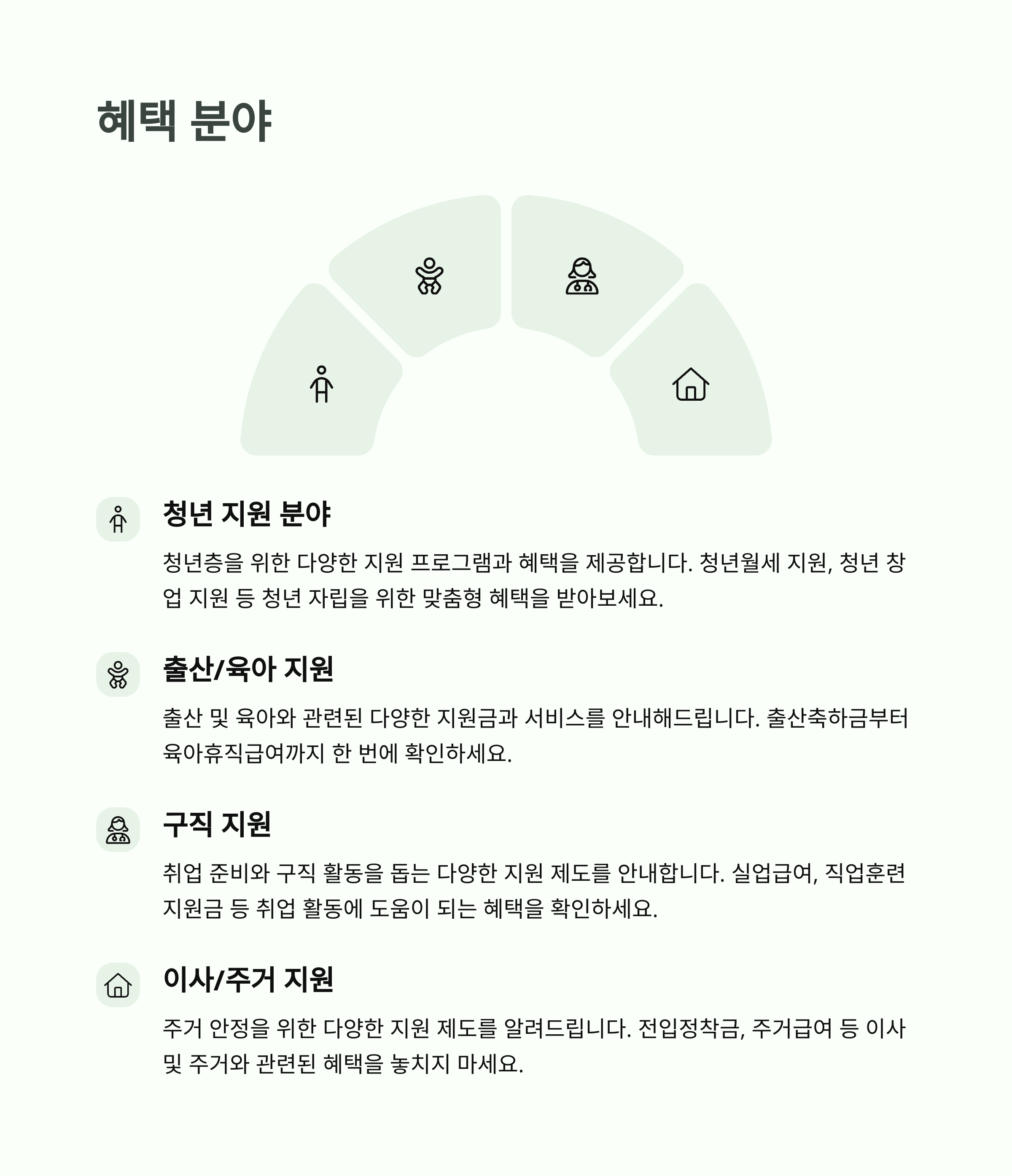 | 관심 분야 설정 | 청년, 출산 등 관심 있는 분야 중심으로 맞춤 추천 |