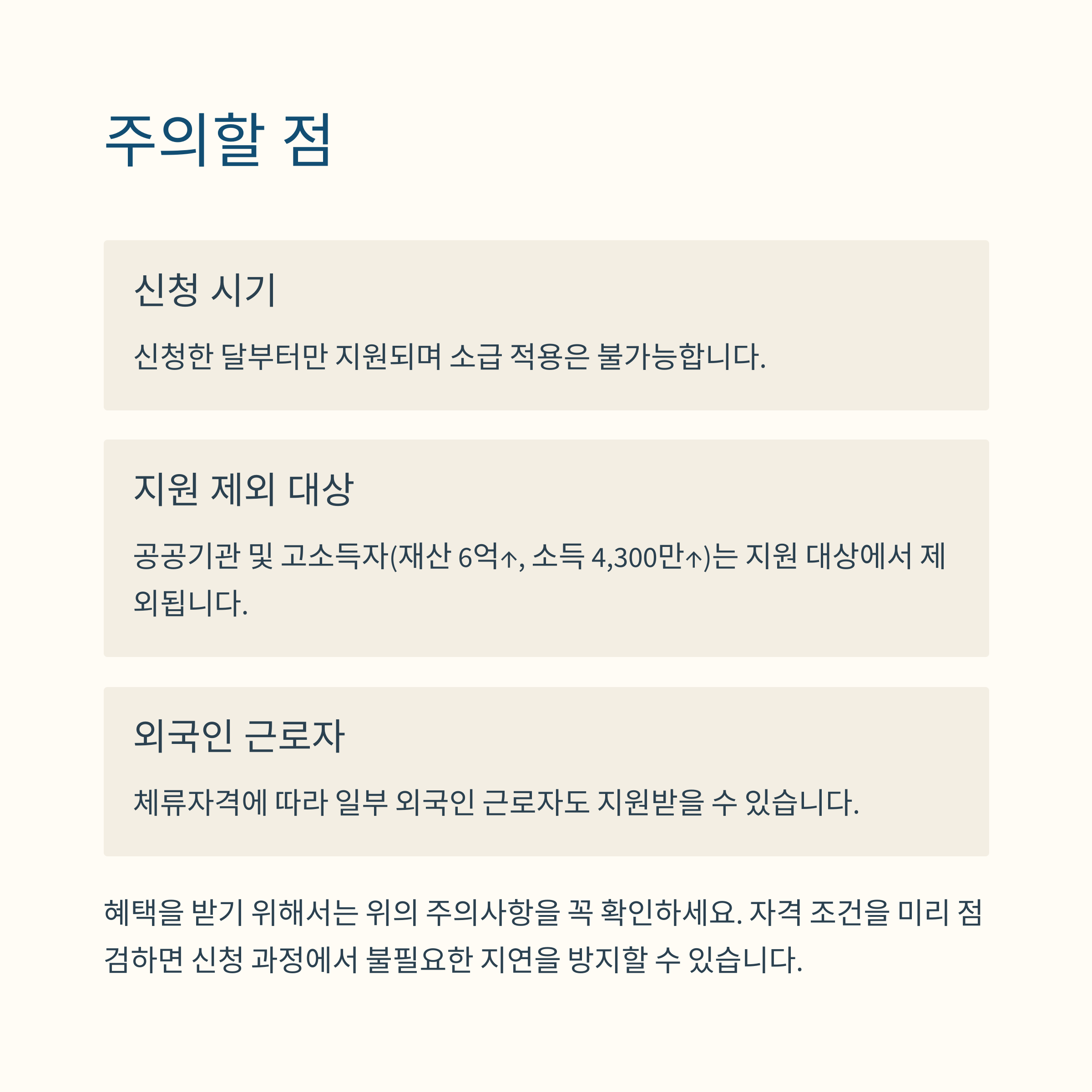 | 유형 | 지원 대상 요건 | 지원 항목 | 지원 제외 조건 |