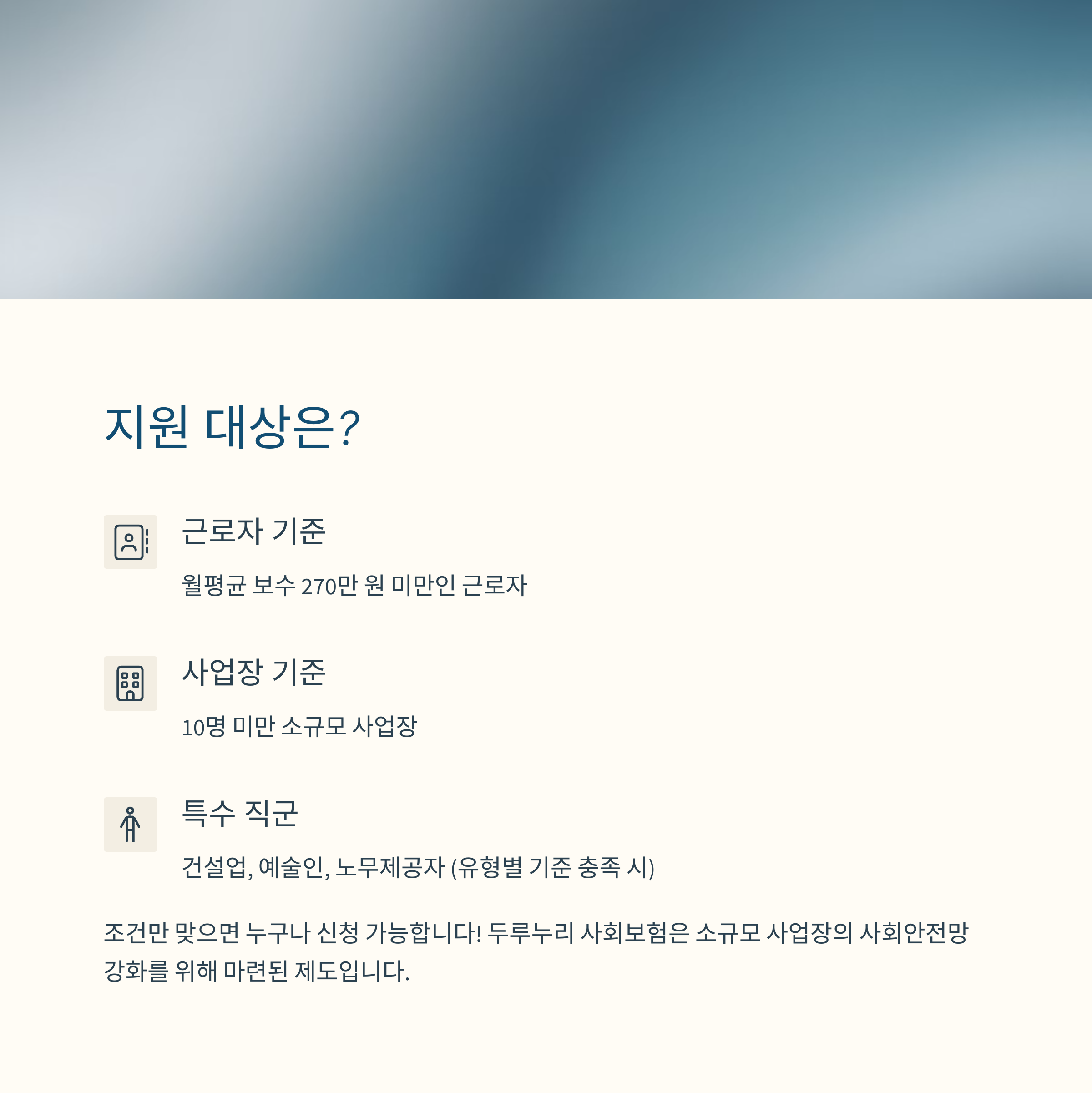 | 노무제공자 (특고) | - 퀵서비스, 학습지, 보험설계 등 지정 직종 - 월 보수 270만원 미만 - 복수 사업장 보수 합산 |