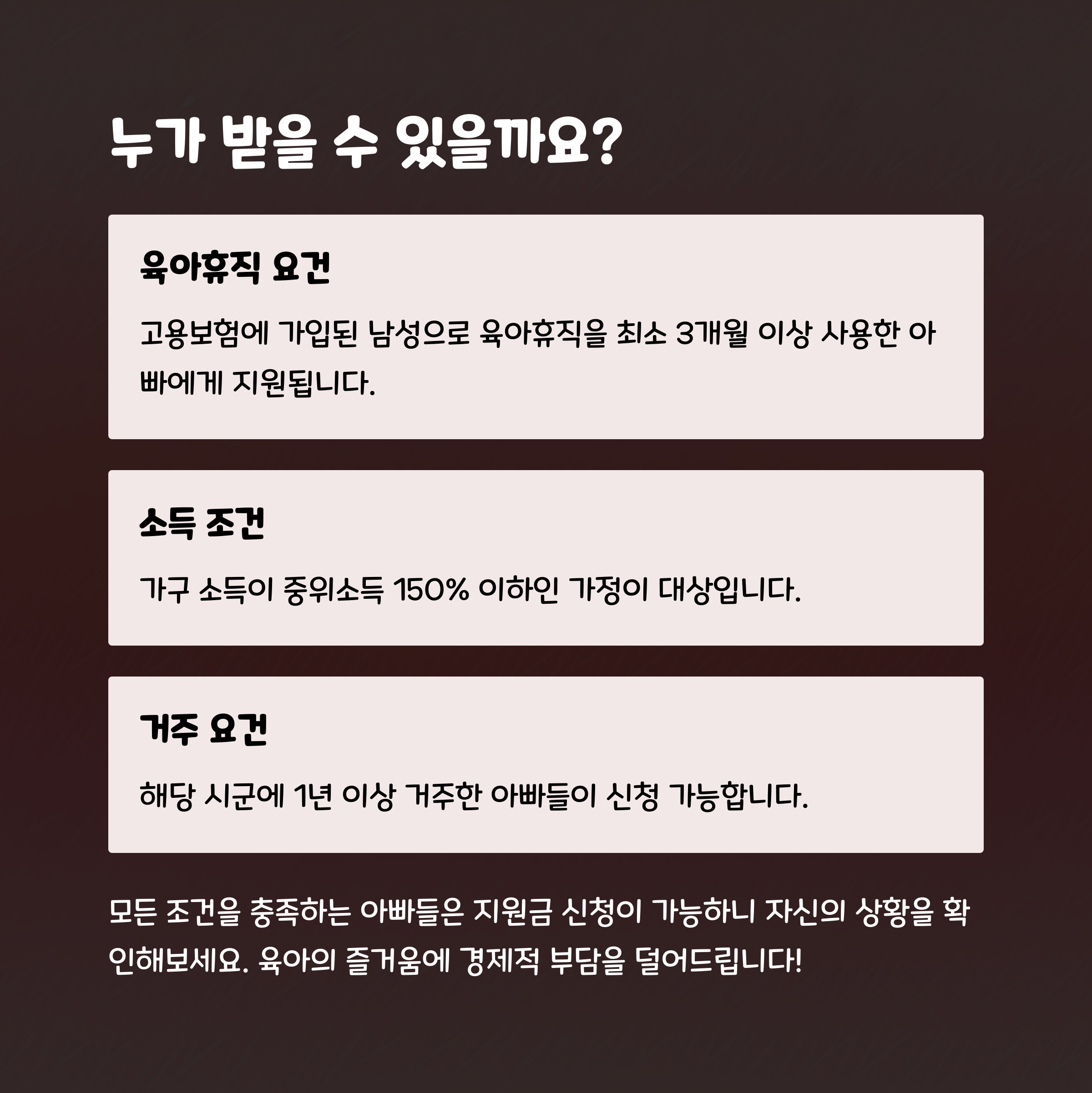 중위소득 150% 이하, 고용보험 수급자, 육아휴직 3개월 이상, 8개 시군 1년 이상 거주한 남성 육아휴직자입니다.