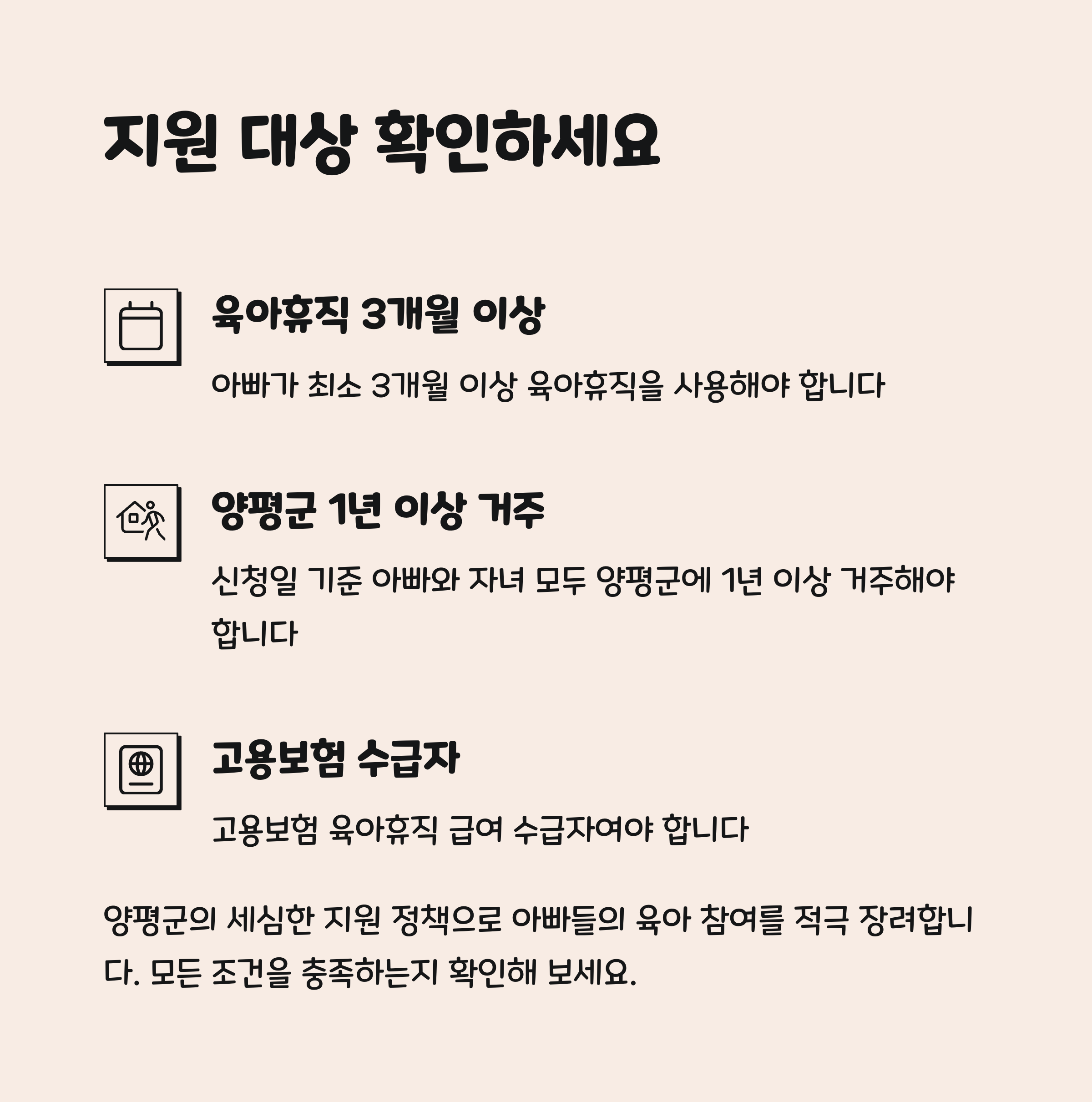 | 신청 조건 | 양평군 1년 이상 거주, 자녀도 주민등록 필요, 중위소득 150% 이하 |