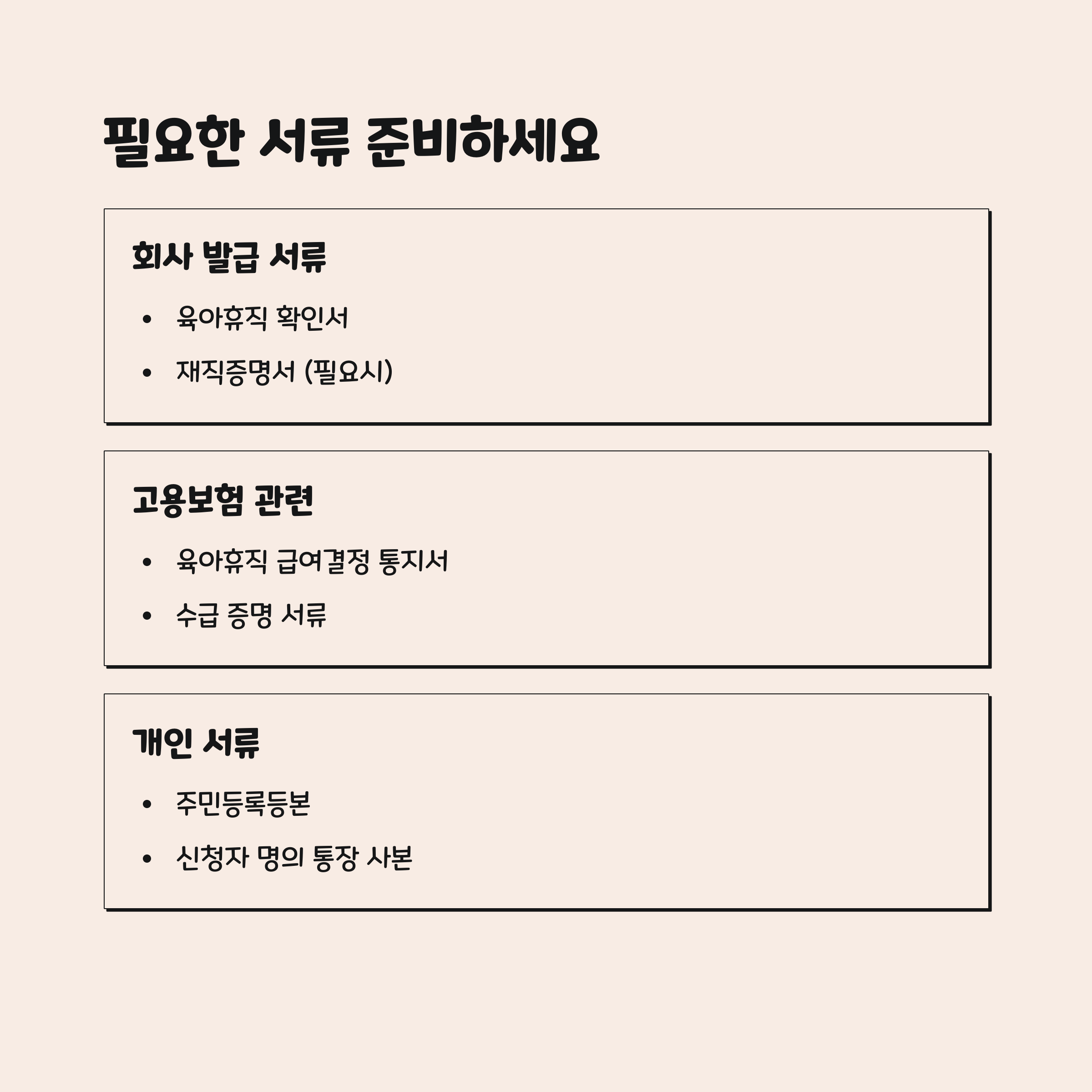 - 필수서류: 육아휴직 확인서, 급여 수급 확인서, 주민등록등본 등