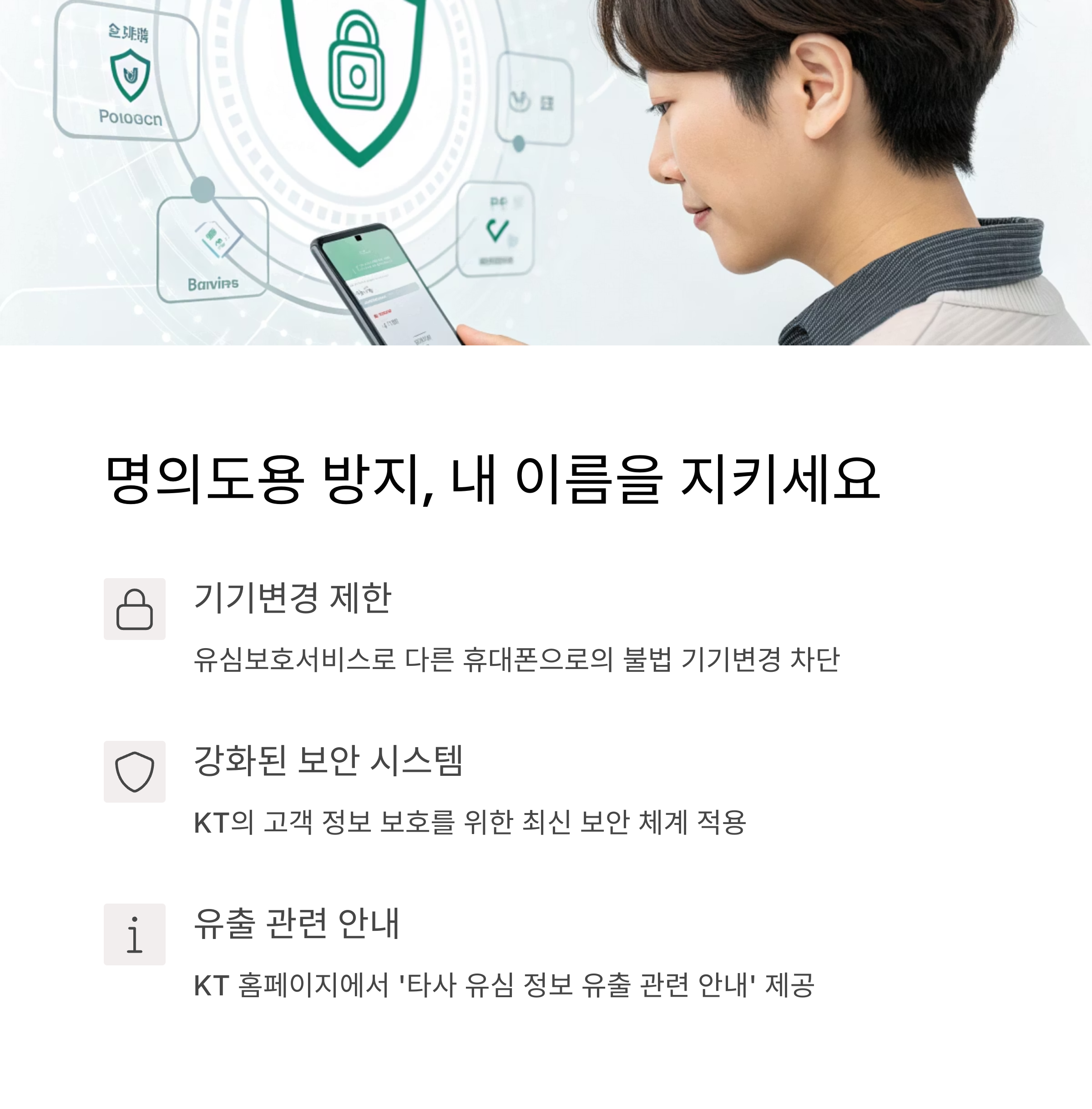 내 이름을 도용해 무단 가입을 막기 위한 필수 조치입니다. KT 이용자는 통신 3사 공동 제공하는 'M-safer'를 통해 명의도용 알림 서비스를 무료로 이용할 수 있습니다.