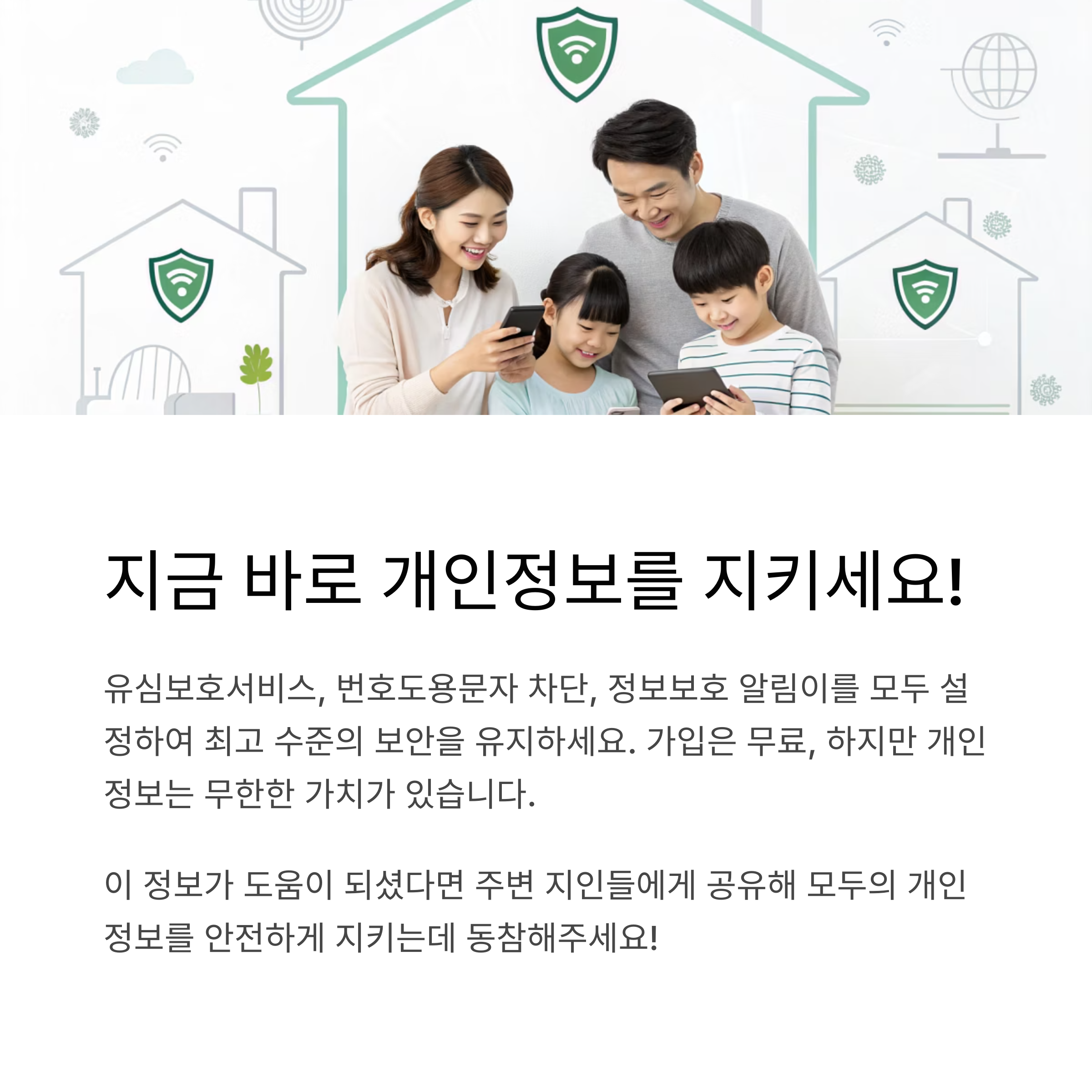KT 이용자라면 지금 바로 '유심 보호 서비스', '명의도용 방지 서비스', '번호도용 문자 차단'을 신청해 소중한 개인정보를 보호하세요! 그리고 2단계 인증까지 완료하면 더 완벽한 보안 체계를 구축할 수 있습니다. 오늘 바로 시작해보세요!