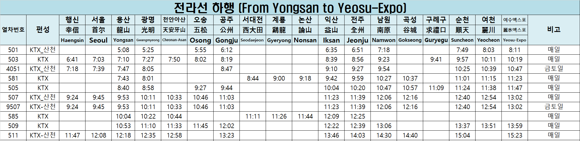 | 2025년 여수엑스포역 → 용산역 KTX 상행선 시간표 안내 🚄 (6월 변경 포함) (0) | 2025.05.05 |