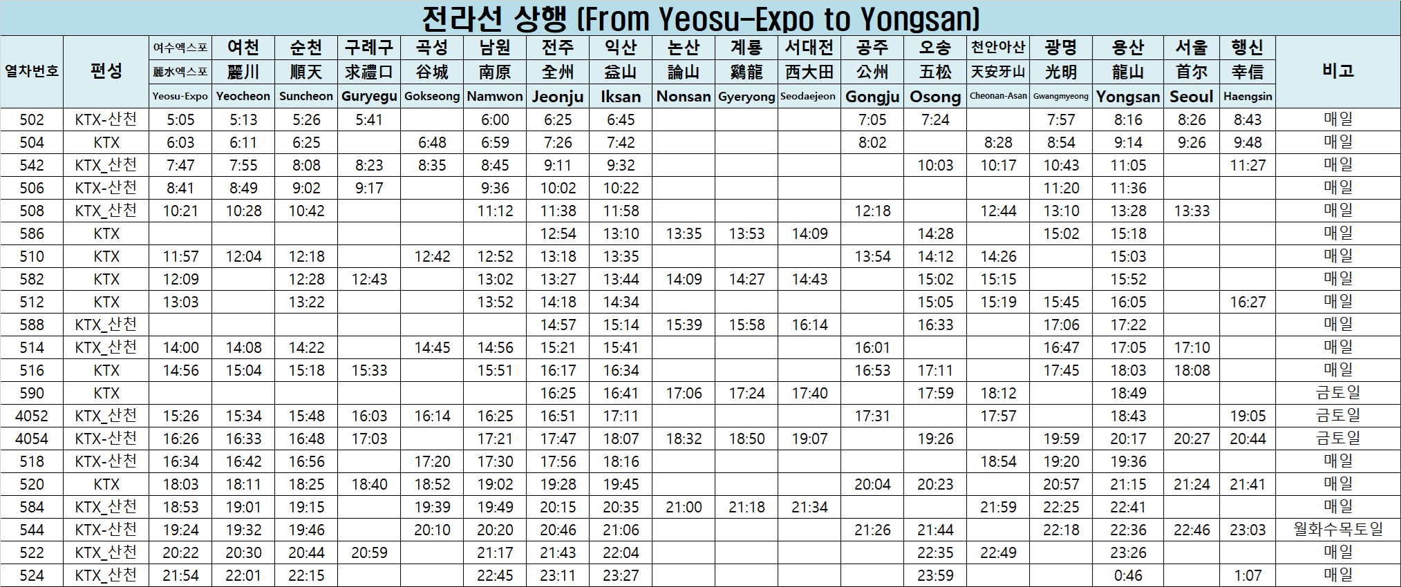 | 2025년 서울(용산역) → 여수엑스포 KTX 시간표 총정리 🚄 변경 예정 시간표까지 한눈에! (0) | 2025.05.05 |