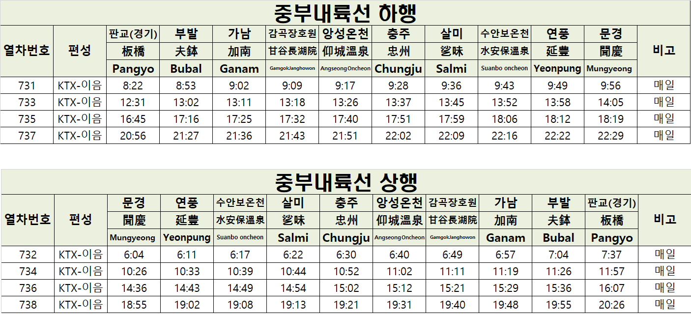 중부내륙선 KTX-이음은 2024년 11월 30일 개통 이후 수도권(판교)에서 충북, 경북 내륙 지역(문경)까지 약 1시간 30분 만에 연결하는 고속철도입니다. 2025년 6월 1일부터는 새로운 시간표가 적용되어 더욱 편리해진 운행 정보를 확인할 수 있습니다.