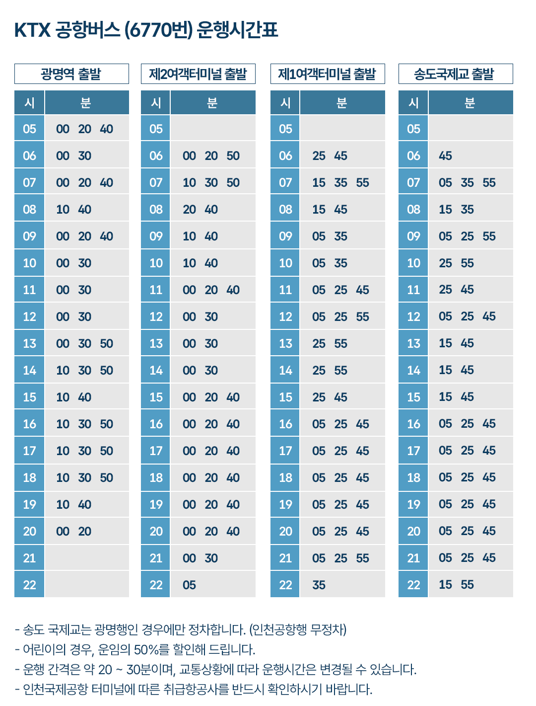 | 광명역 → 인천공항 | 05:00 | 20:20 | 약 20~30분 |