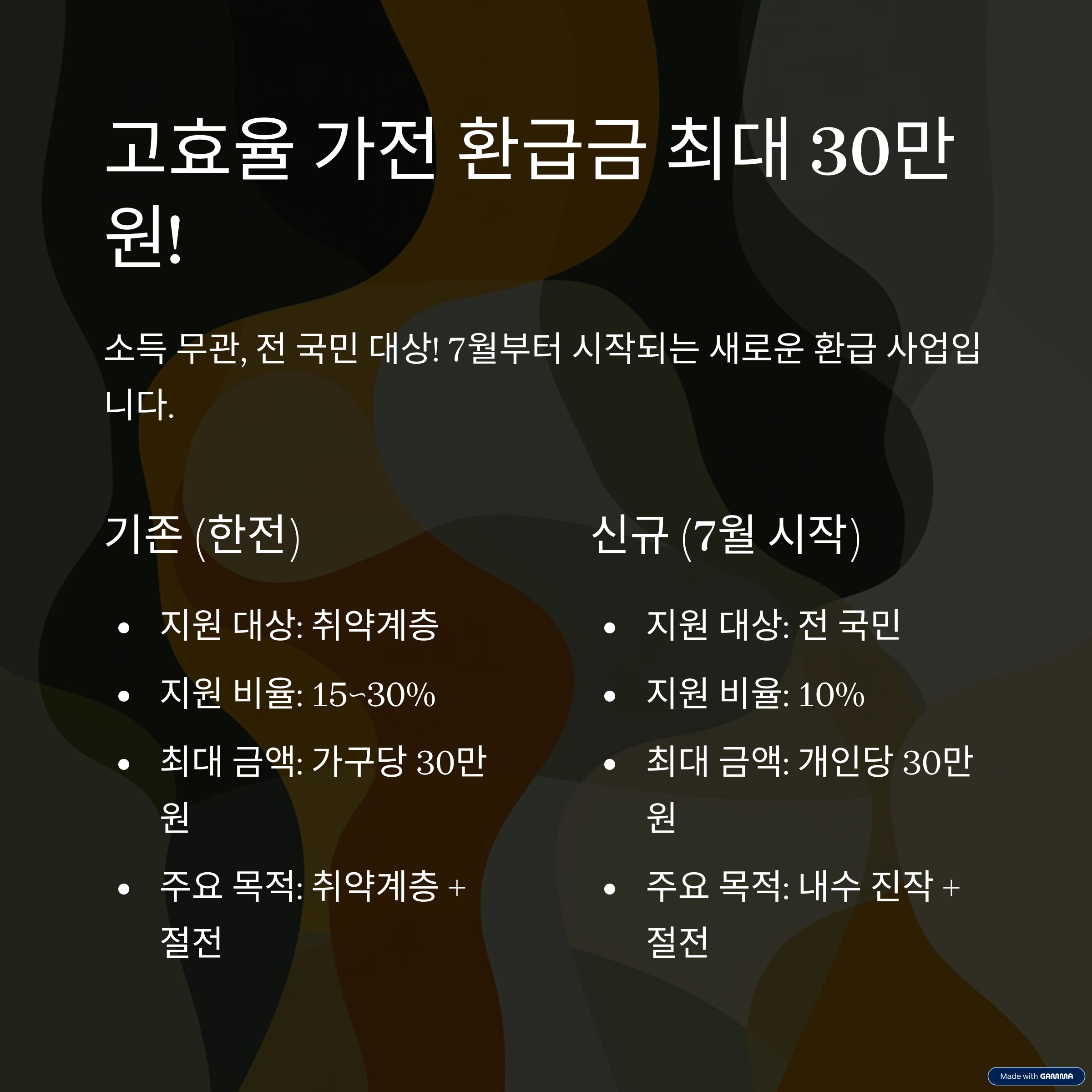 이와 별도로 7월에는 전 국민 대상 고효율 가전 환급금도 시작됩니다. 소득과 무관하게 누구나 신청 가능하며, 최대 30만 원까지 현금 환급됩니다. 아래는 기존 제도와 비교표입니다.