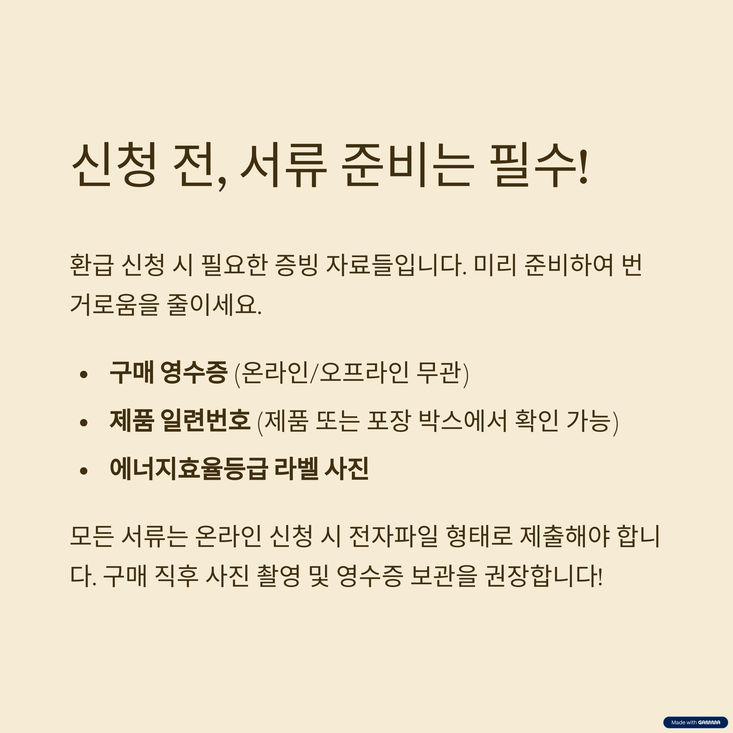 이 모든 서류들은 온라인 신청 시 전자파일 형태로 제출해야 하며, 누락되면 환급이 거절될 수 있습니다. 구매 후 바로 촬영해두면 이후 신청 시 편리하게 사용할 수 있습니다.