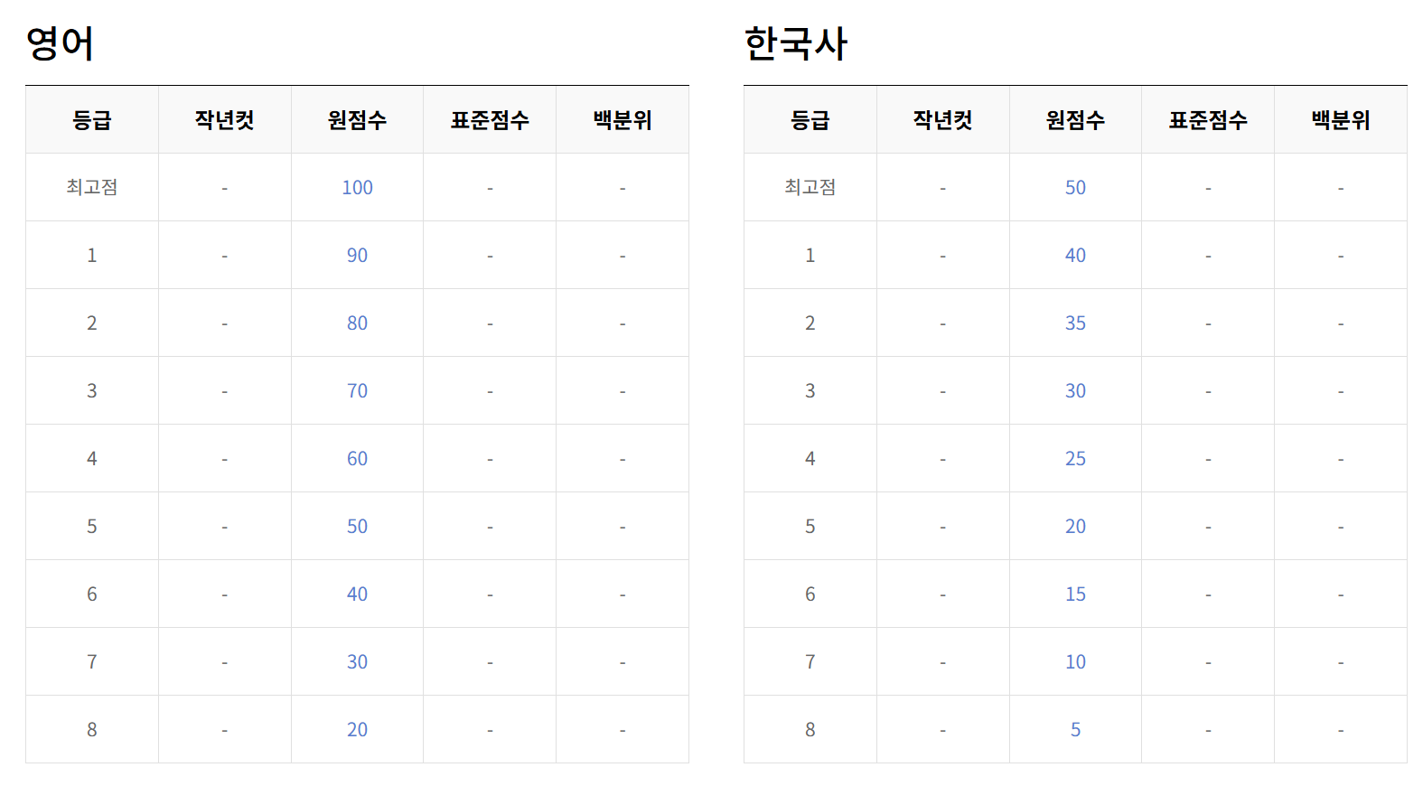 | 등급 | 원점수 | 표준점수 | 백분위 |