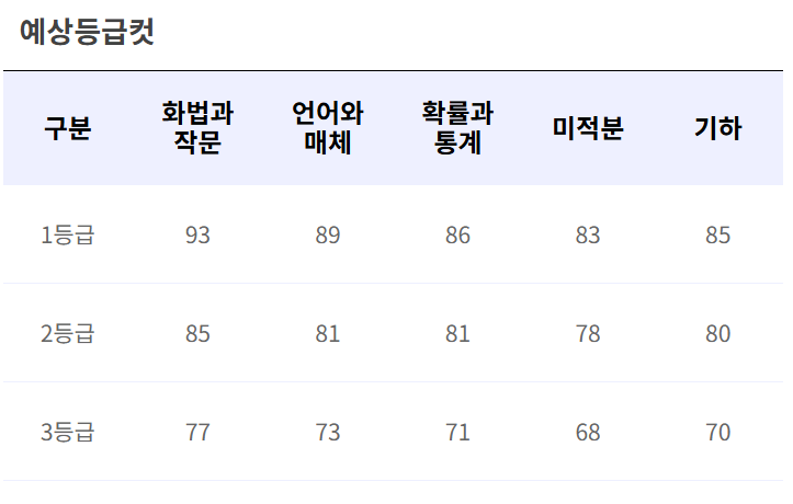 아래 표는 예상 등급컷(참고용)입니다. 실제 정식 등급컷과는 차이가 있을 수 있으니, 발표 후 반드시 평가원 또는 EBSi 등급컷 페이지에서 재확인하세요.