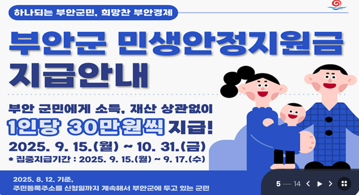 | 전북 부안군 | 1인당 30만 원 | 9월 중(세부 일정 군청 공지) | |