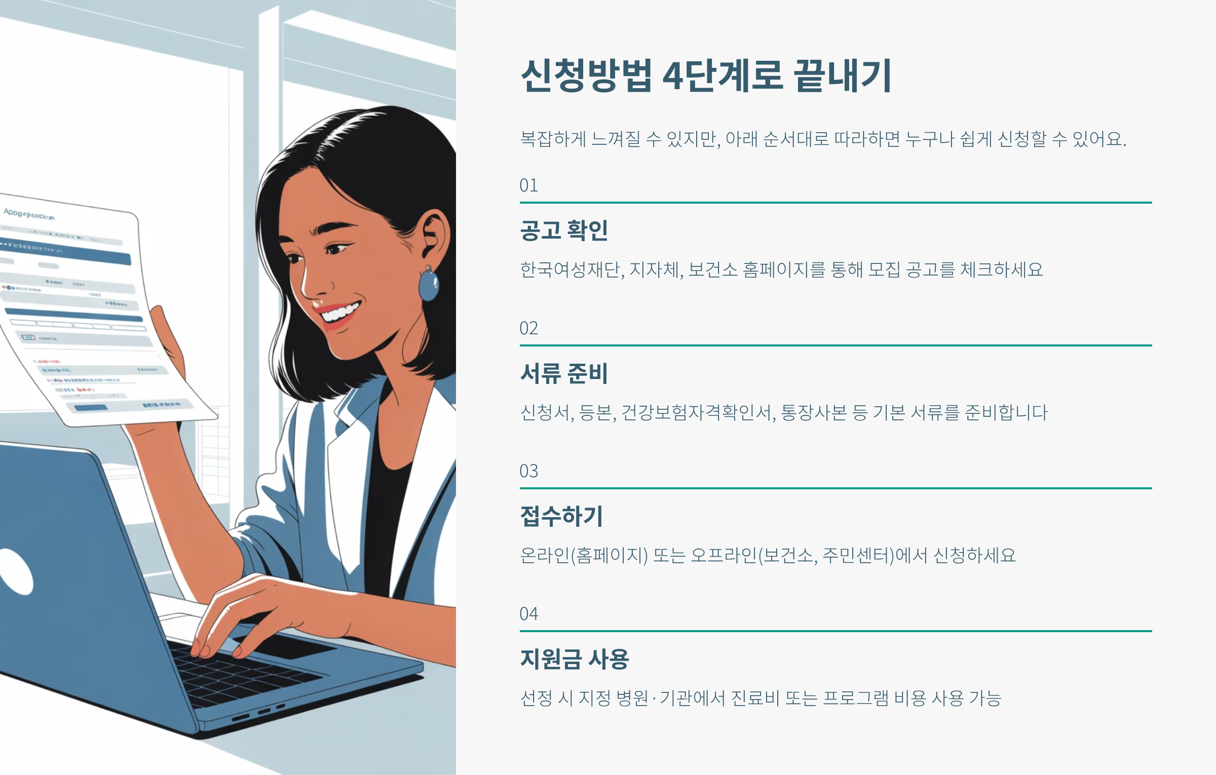 한국여성재단, 보건소, 여성가족부 등 홈페이지에서 공고가 나오는 즉시 신청 준비하세요!