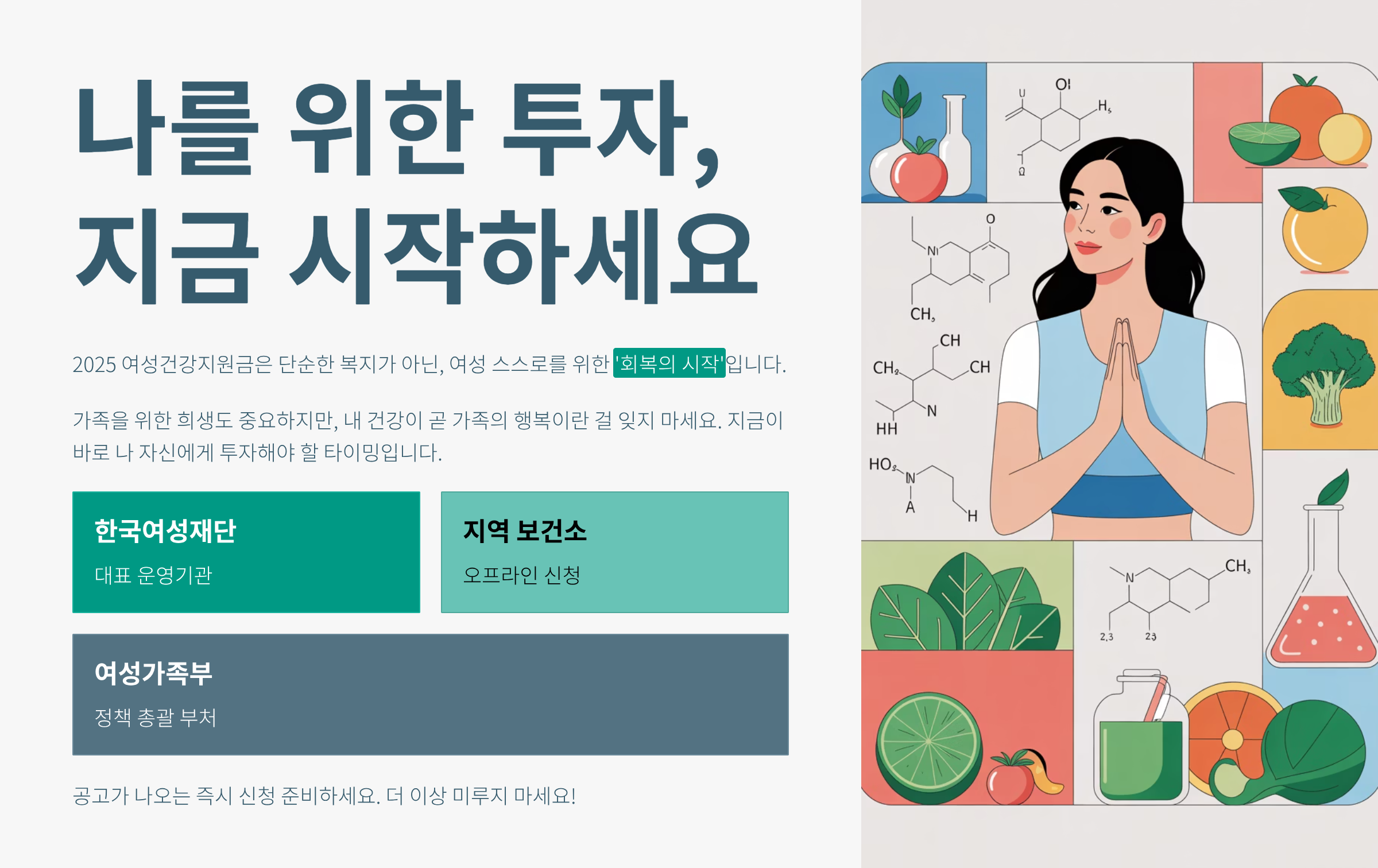 2025 여성건강지원금은 단순한 복지가 아닌, 여성 스스로를 위한 ‘회복의 시작’입니다.