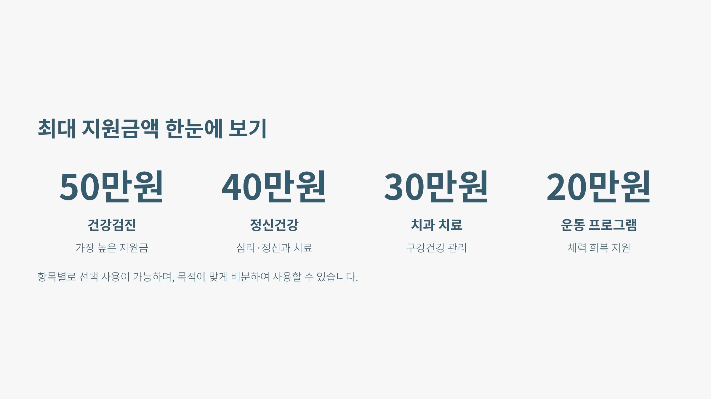 | 건강검진 | 종합검진, 여성 질환 중심 항목 | 최대 50만원 |