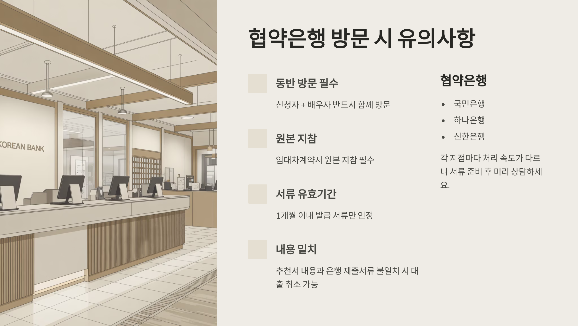 협약은행은 국민·하나·신한이며, 각 지점마다 처리 속도가 다르니 서류가 준비되면 미리 상담 후 방문하는 게 좋습니다.