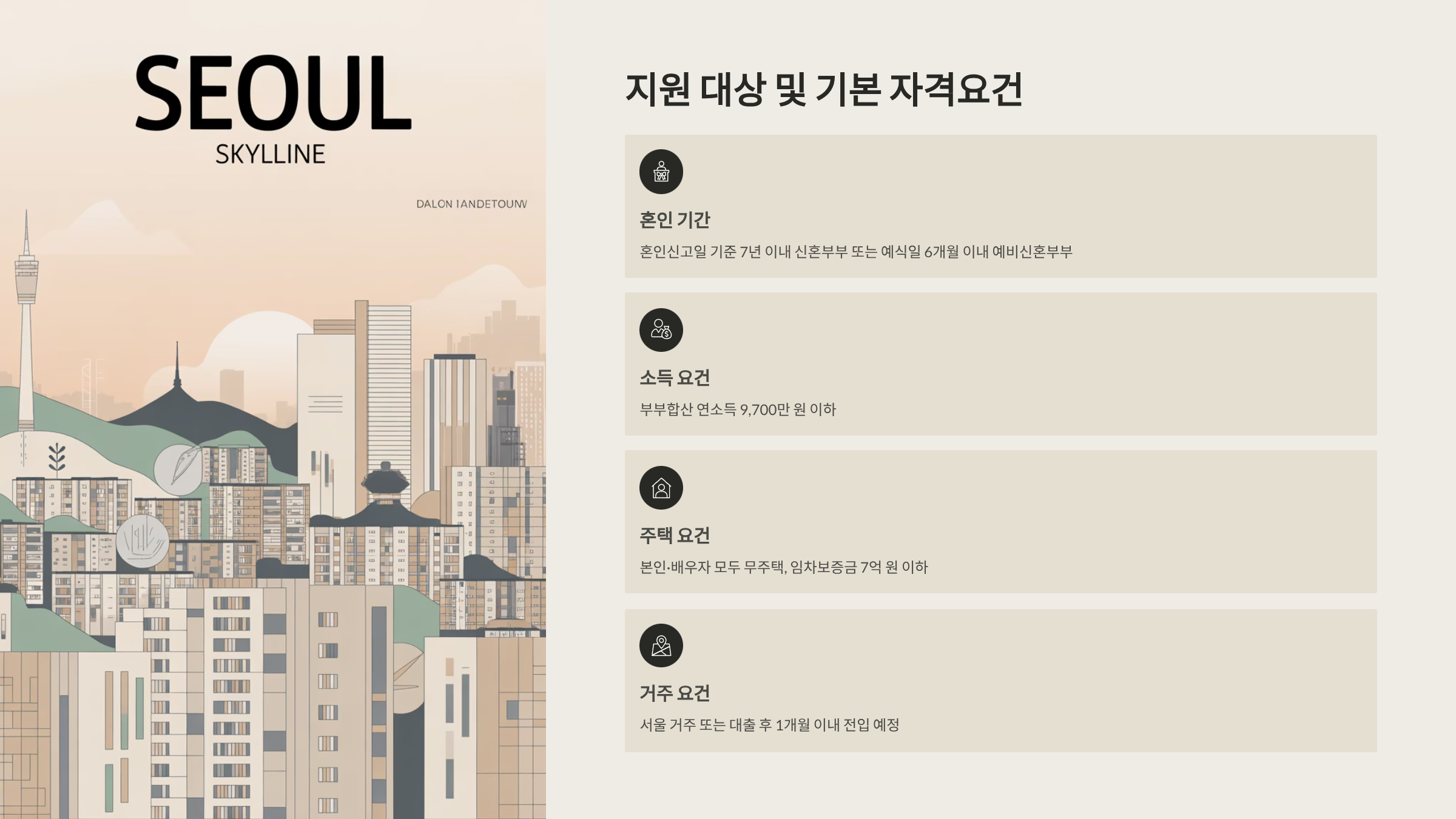 위 조건만 보면 복잡해 보이지만, 실제로는 ‘결혼 7년 이내 + 무주택 + 소득 9,700 이하’라면 대부분 신청 가능합니다. 서울 외 지역에 거주 중이어도 전입 예정이면 신청할 수 있다는 점도 기억해두면 좋습니다.