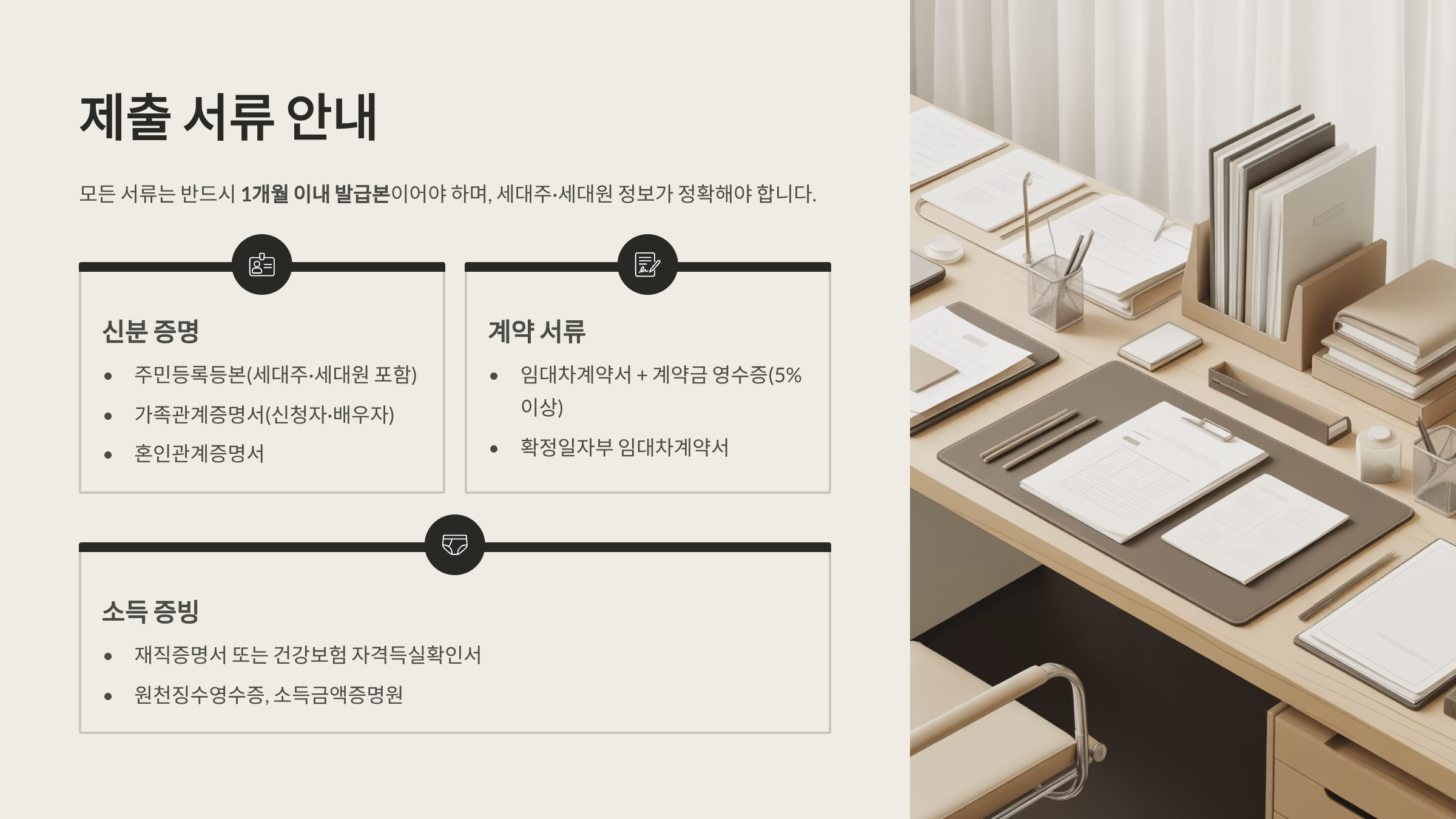 모든 서류는 반드시 1개월 이내 발급본이어야 하며, 세대주·세대원 정보가 정확히 나와야 심사 지연을 피할 수 있습니다.