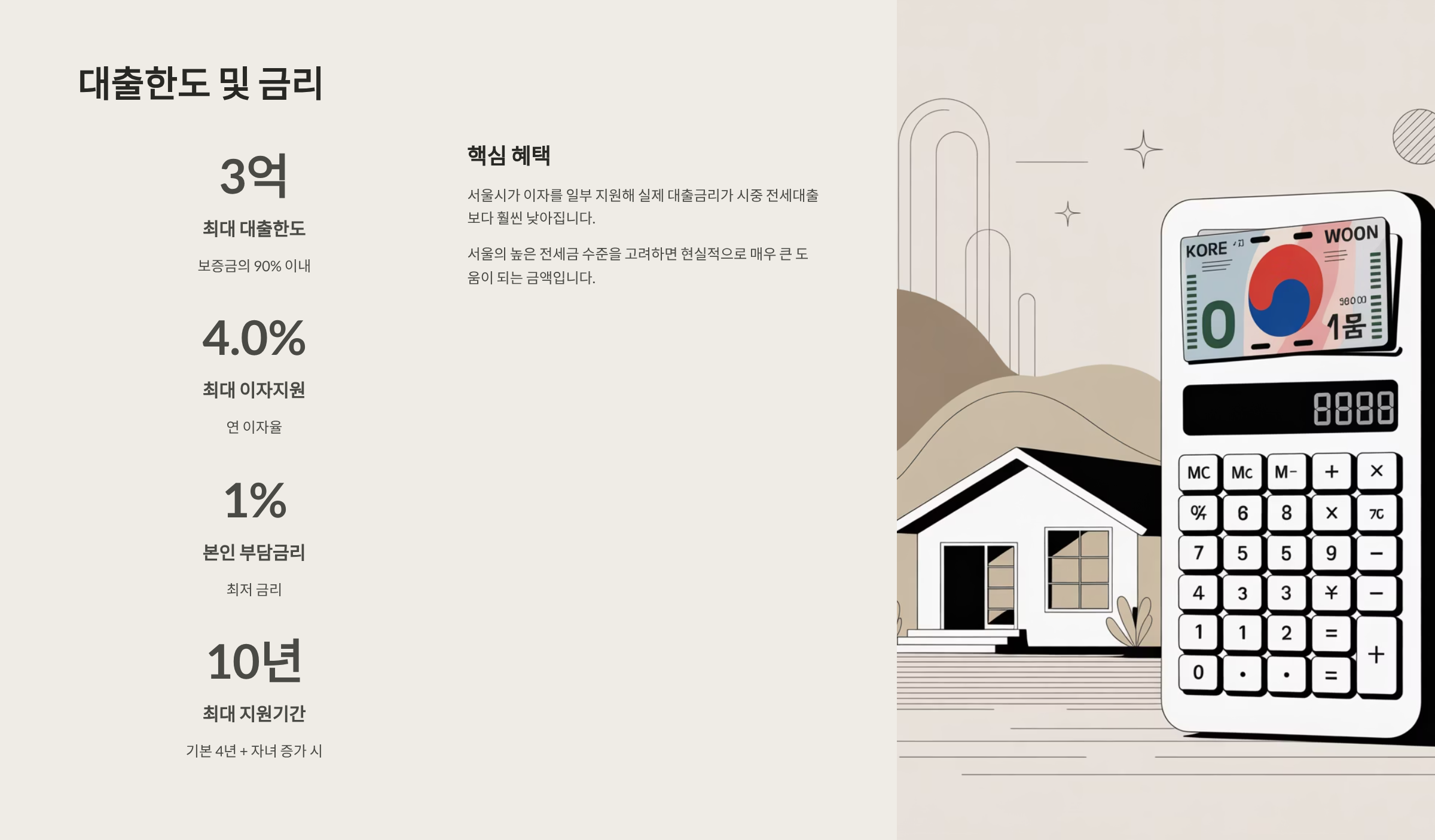 이 제도의 핵심 혜택은 최대 3억 원까지 대출이 가능하다는 점입니다. 서울의 전세금 수준을 고려하면 현실적으로 매우 큰 도움이 되는 금액입니다.