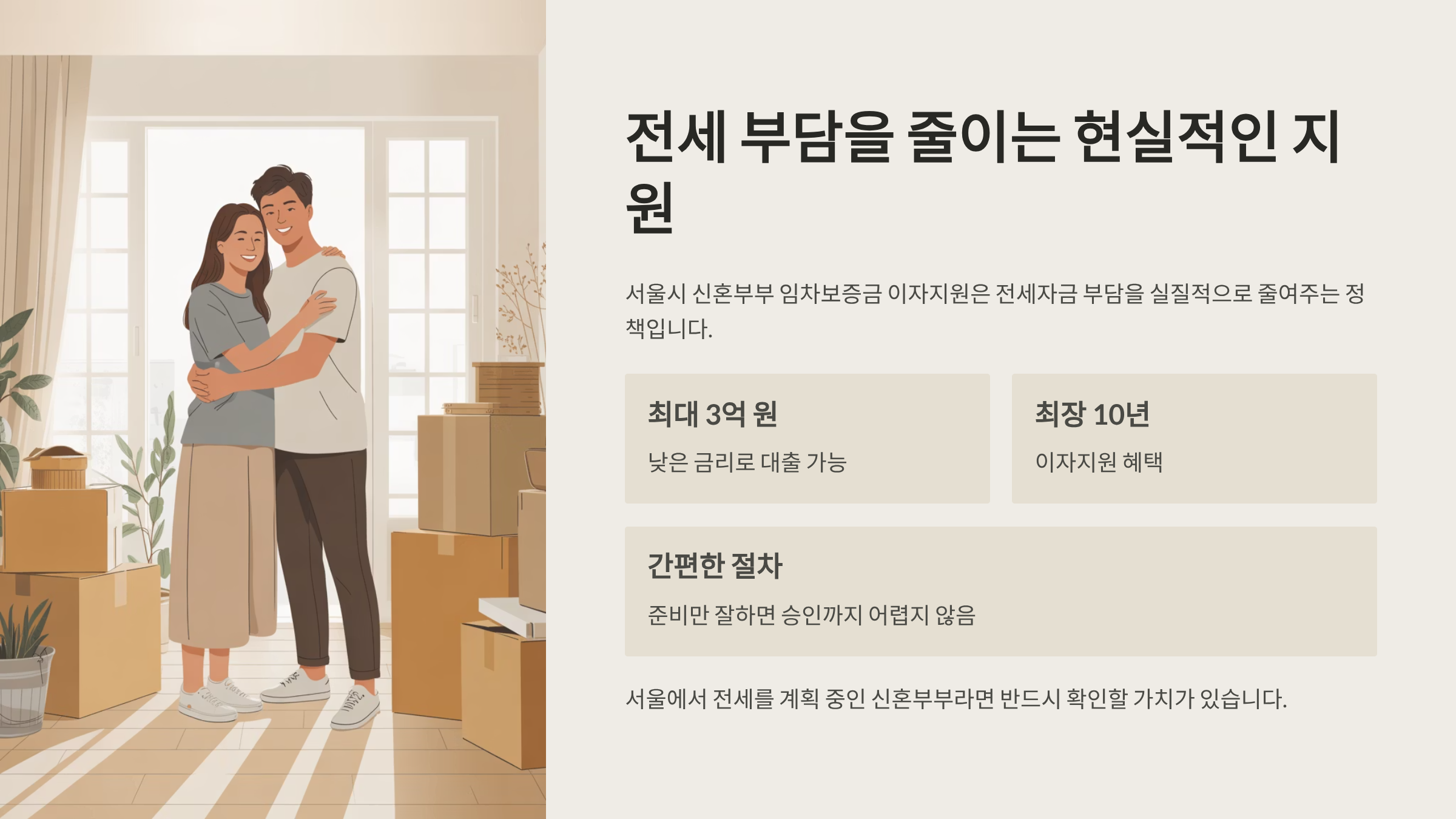 서울에서 전세집을 구하려는 신혼부부라면 ‘임차보증금 이자지원’ 제도를 꼭 확인해야 합니다. 최대 3억 원까지 낮은 금리로 대출을 받을 수 있고, 조건만 맞으면 최장 10년까지 이자지원을 받을 수 있어 실제로 많은 부부들이 전세 부담을 크게 줄이고 있습니다. 아래에서 자격요건, 한도, 서류, 신청절차까지 하나씩 정리해드립니다.