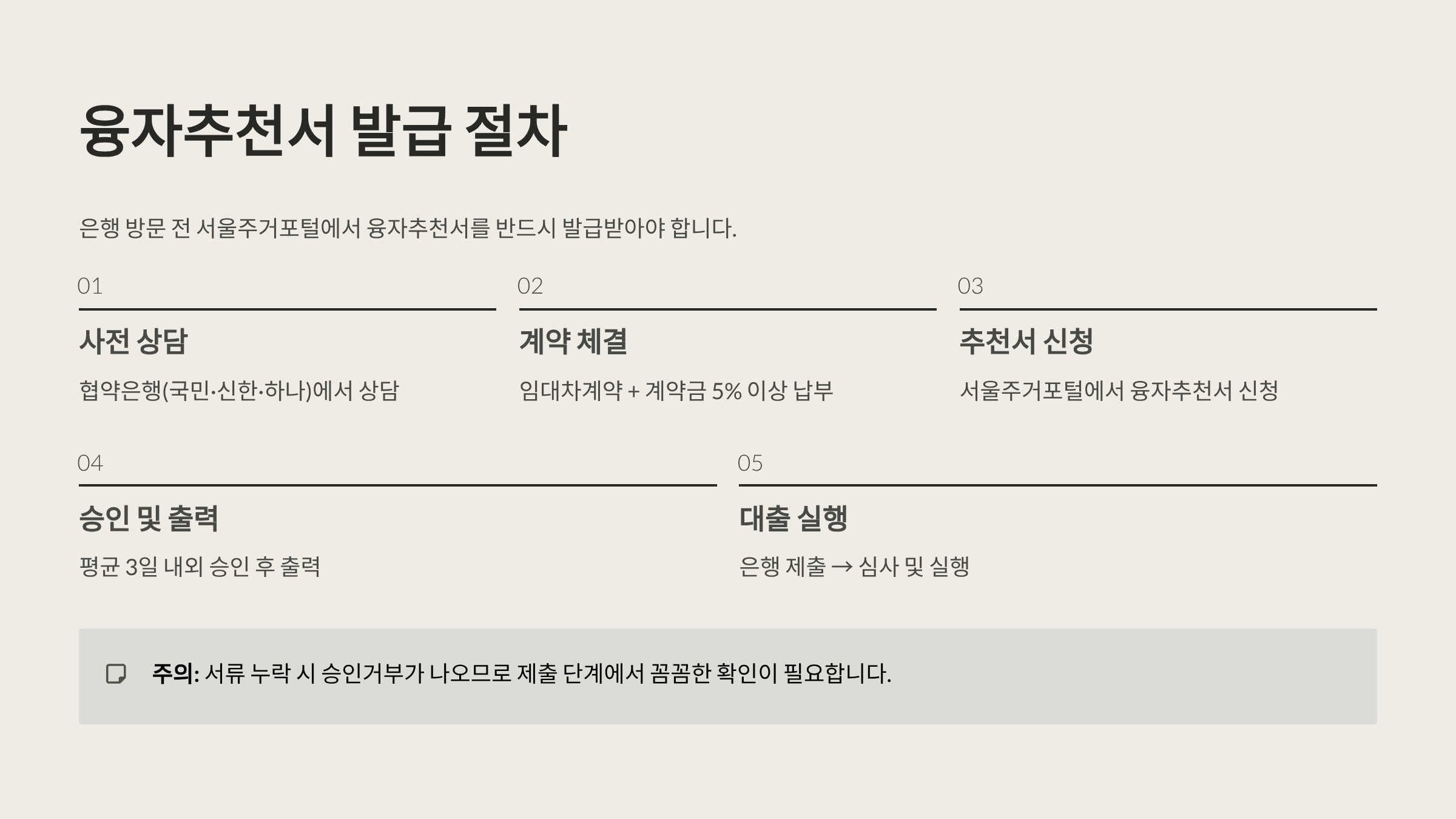 대부분 ‘은행에만 가면 된다’고 생각하지만, 실제로는 서울주거포털에서 융자추천서를 발급받아야 절차가 진행됩니다.