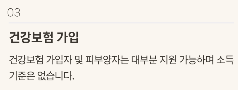 - 건강보험 가입자(피부양자 포함)라면 대부분 지원 대상 가능