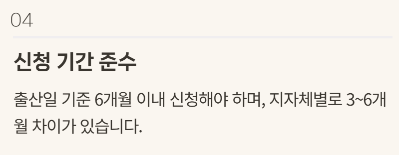 - 보통 출산일 기준 6개월 이내 신청해야 함