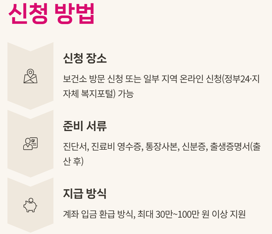 대부분 출산일 기준 6개월 이내에 신청해야 하고, 기한이 지나면 지원이 불가능해지는 경우가 많습니다. 출산과 동시에 진료비 영수증과 진단서를 잘 보관해 두었다가, 여유가 생기는 대로 보건소에 상담 후 바로 신청하는 것이 좋습니다.
